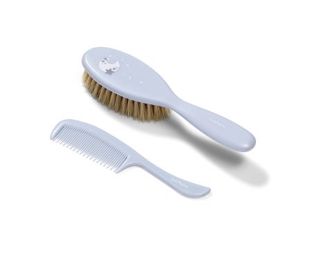Mäkká kefa na vlasy na vlasy s jemnými prírodnými štetinami a antistatickými vlastnosťami dokonale masíruje hlavičku dieťaťa, zatiaľ čo hrebeň so zaoblenými končekmi zabraňuje podráždeniu pokožky.