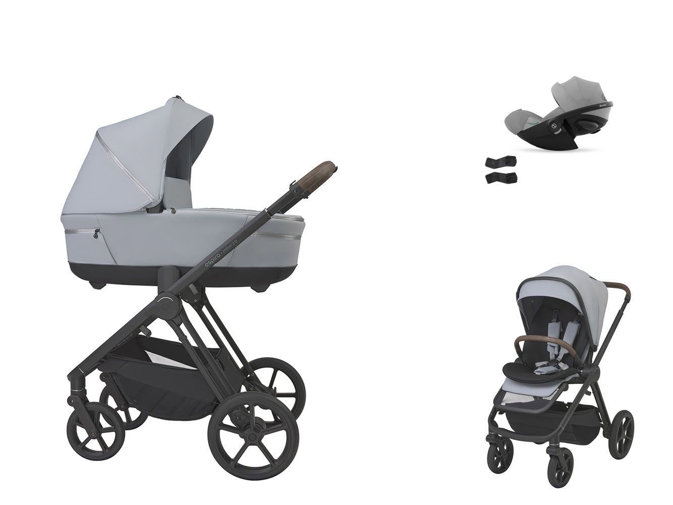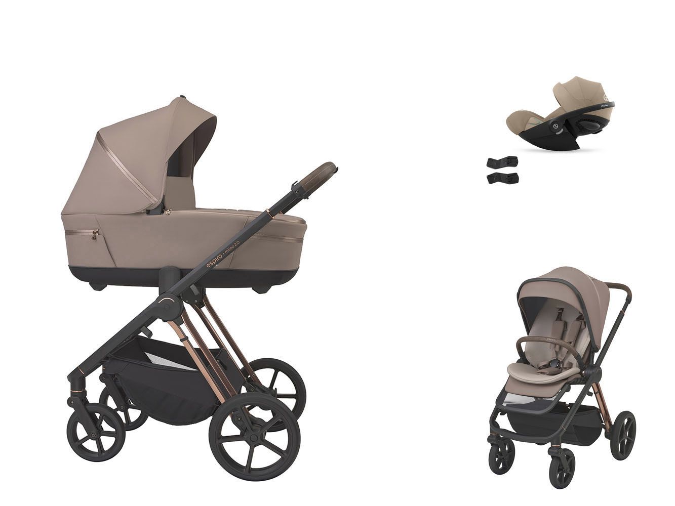 Konštrukcia Espiro Miloo 2.0 Športová sedačka + nánožník Hlboká vanička + nánožník Autosedačka Cybex Cloud G Plus i-Size Adaptéry pre autosedačku Elegantná taška pre rodiča Puzdro na fľašu Prebaľovacia podložka Obojstranná vložka Panel HOT&COOL 2× pláštenka 2× sieťka proti hmyzu Držiak na nápoje Výškové adaptéry Taška do košíka Panel uzatvárajúci kôš