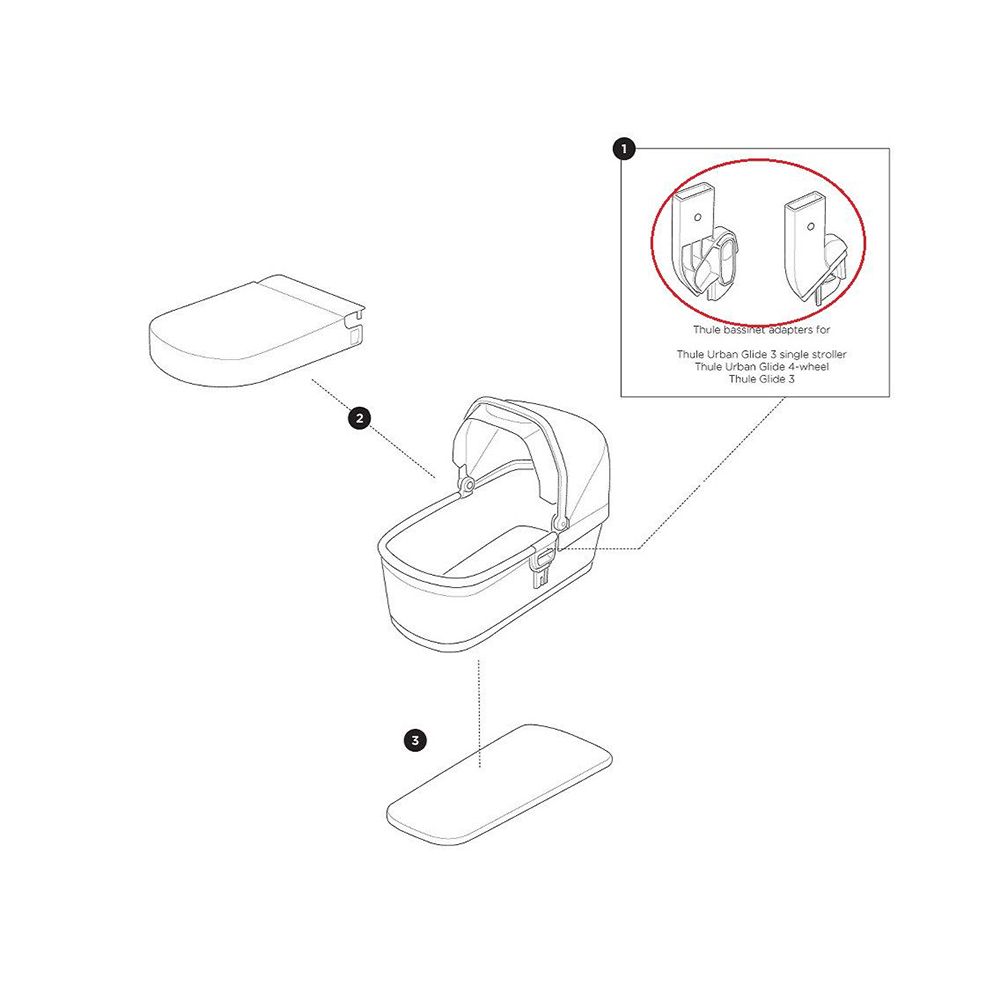 Náhradné adaptéry pre vaničku Bassinet generácie G3, umožnia jej zaistenie na konštrukciu kočíka Thule Urban Glide 3 single, Thule Urban Glide 4-Wheel.