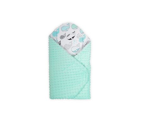 Spevnená zavinovačka s oceánom plným modrých a mätových veľrýb v kombinácii s farebnou minky textíliou.