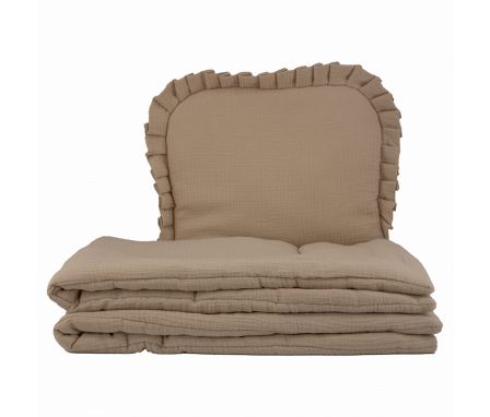 Mäkká súprava s veľkou prikrývkou vhodná do postieľky, kolísky alebo aj kočíka z bavlneného mušelínu najvyššej kvality. Mušelínová tkanina je oveľa jemnejšia k pokožke dieťaťa ako klasická bavlna. Vďaka tomu je u rodičov veľmi obľúbená. Výplň je z ľahkých silikónových antialergických vlákien.