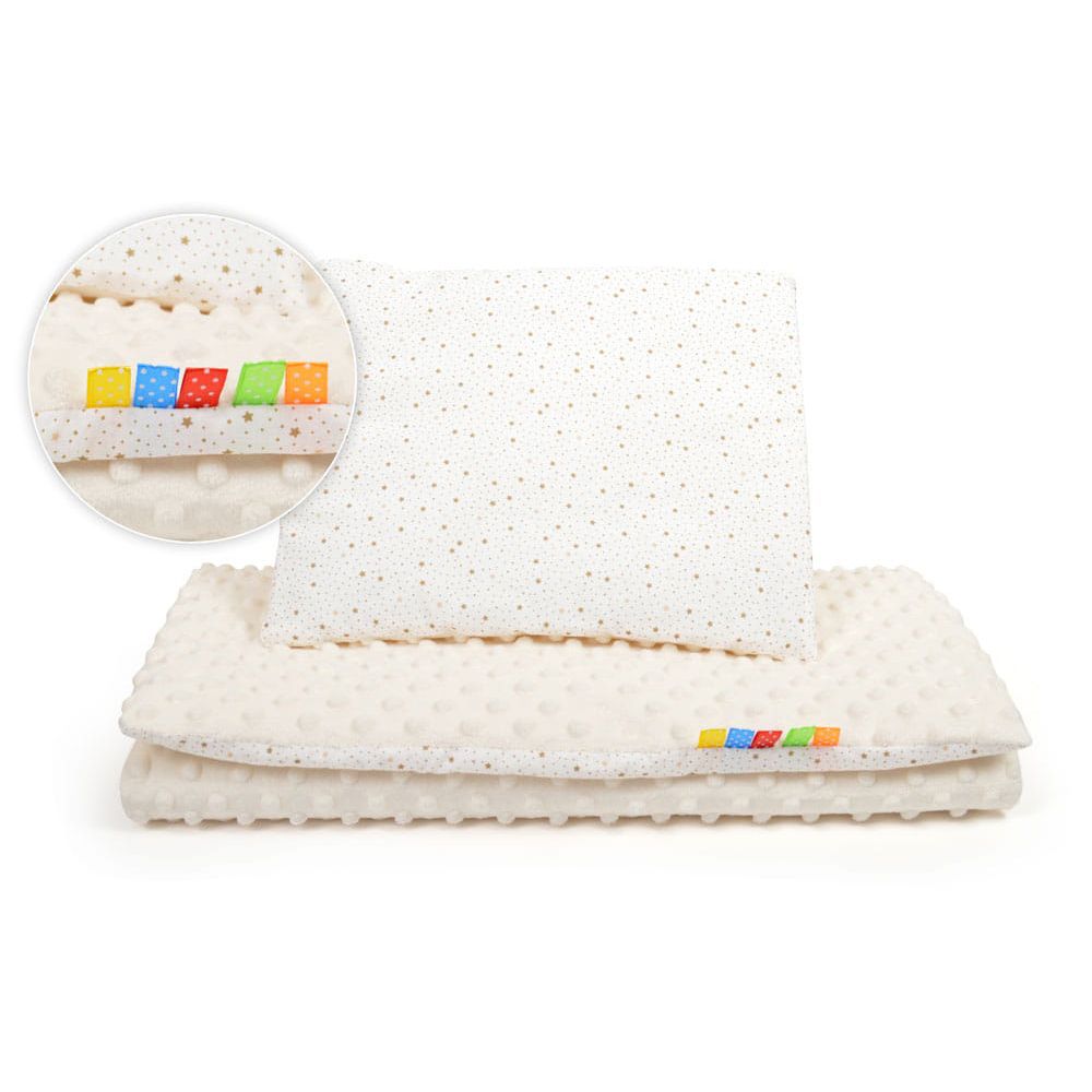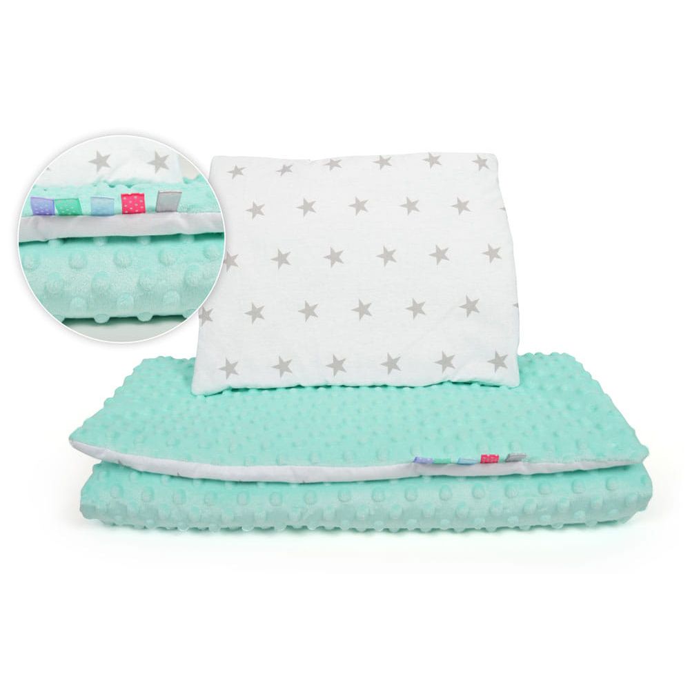 Mäkká súprava ideálna do kočíka, kolísky alebo autosedačky. Jedna strana je vyrobená z minky textílie, ktorá je výnimočne mäkká a jemná na dotyk. Jej trojrozmerná štruktúra dokonale zaisťuje tepelný komfort. Druhá strana deky je zo 100% bavlny s certifikátom Oeko-Tex Standard 100. Výplň je z ľahkých silikónových antialergických vlákien.