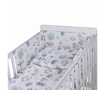 Súprava do postieľky s motívom jeleňa a ježka v modrej farbe. Set Mini s menším paplónom a obliečkou je ideálnym riešením pre malé postieľky.