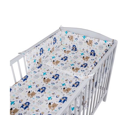 Súprava do postieľky s modrým medvedíkom a jeho lesnými kamarátmi. Set Mini s menším paplónom a obliečkou je ideálnym riešením pre malé postieľky.