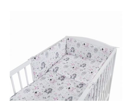 Súprava do postieľky s medvedíkom a jeho lesnými kamarátmi v ružovom prevedení. Set Mini s menším paplónom a obliečkou je ideálnym riešením pre malé postieľky.
