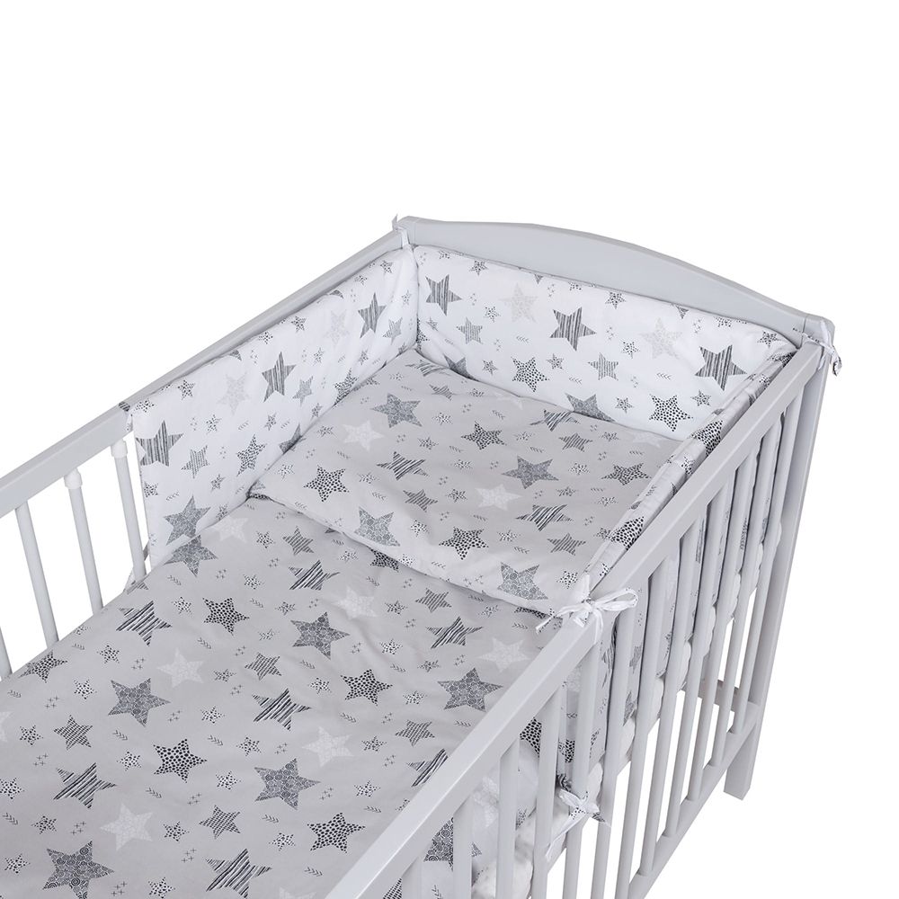 Súprava do postieľky so sivými hviezdami rôznych veľkostí pre spánok plný najkrajších snov. Set Mini s menším paplónom a obliečkou je ideálnym riešením pre malé postieľky.